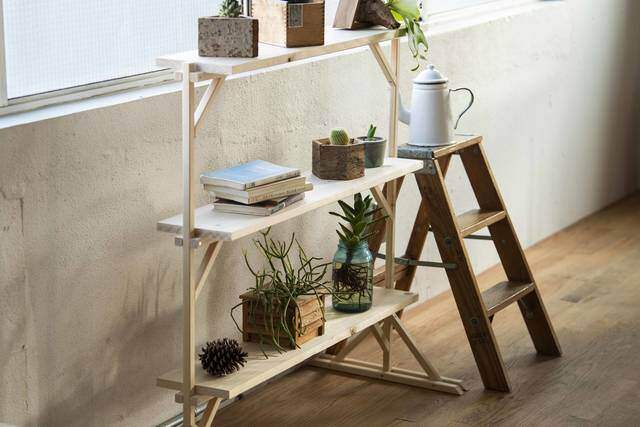 お気に入りのグリーンや小物をディスプレイできるラックをDIY!無駄がないシンプルなデザインなので、インテリアの名脇役として絶妙な存在感を発揮するはず。なんと、たった2種類の木材で完成しちゃいます!