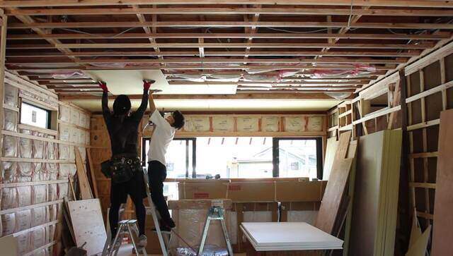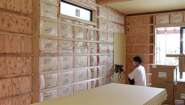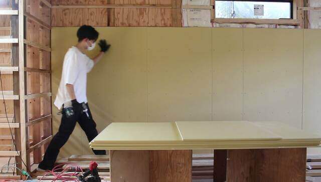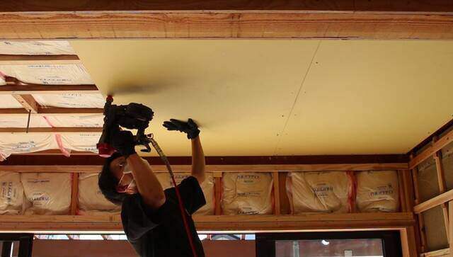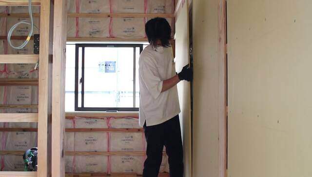今回は全部屋に石膏ボードを張って壁と天井を完成させます。