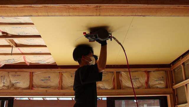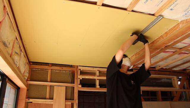 大工さんが合流するまで天井の石膏ボードを1人で張り進めます。