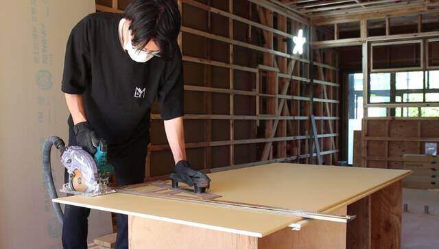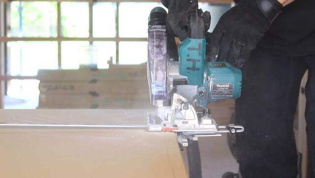微妙にサイズが合わない箇所は、丸ノコガイドTスライドを使って石膏ボードを細くカットして調整します。
