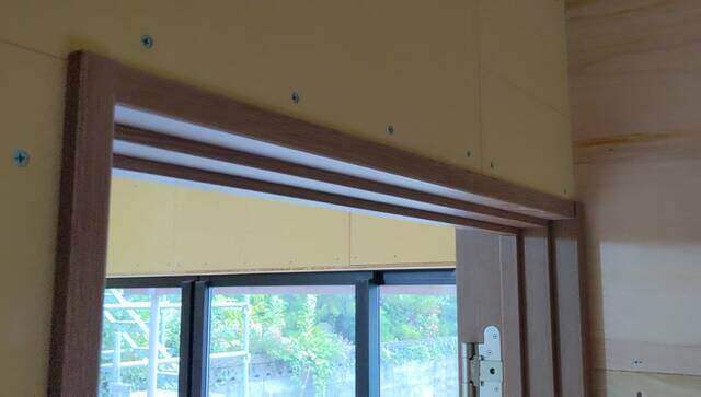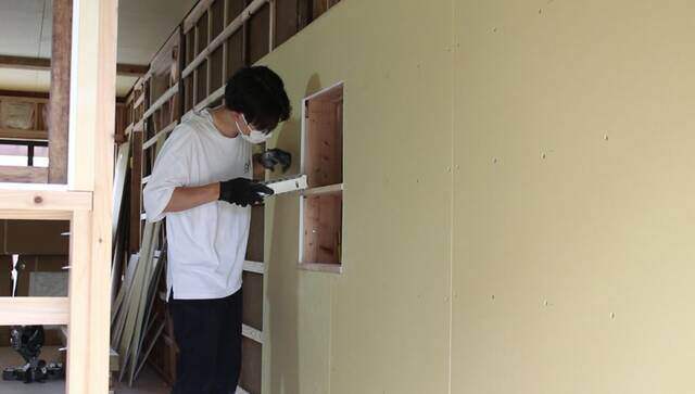 これで枠のまわりにピッタリ合わせるように石膏ボードを張って壁を完成させます。