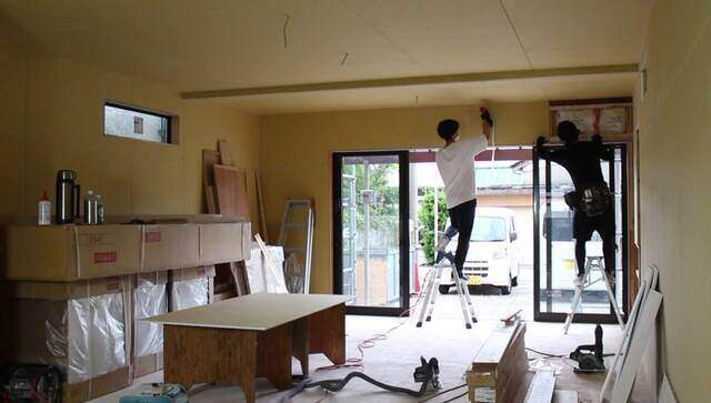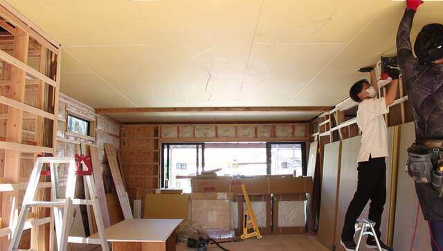 大工さんが合流したので、リビング側の天井を2人で張っていきます。