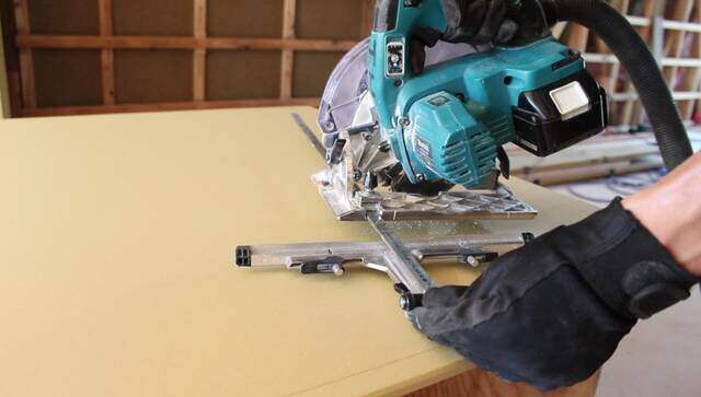 丸ノコガイドエルアングルを使って石膏ボードをサイズに合わせてカットします。