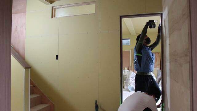 大工さんが石膏ボードをカットした物をひたすらビスを打って張っていきます。