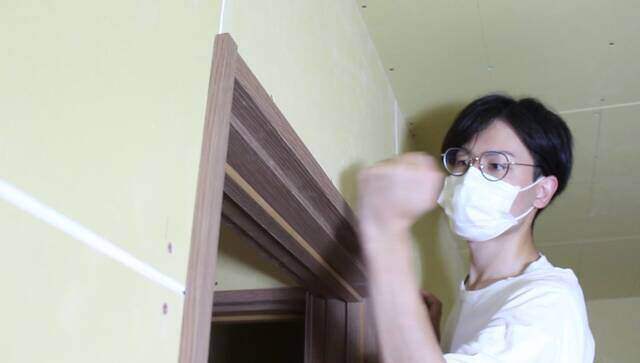 ケーシング枠の場合、壁の上から被せるように仕上げるので、先にドア枠のまわりにも石膏ボードを張ります。