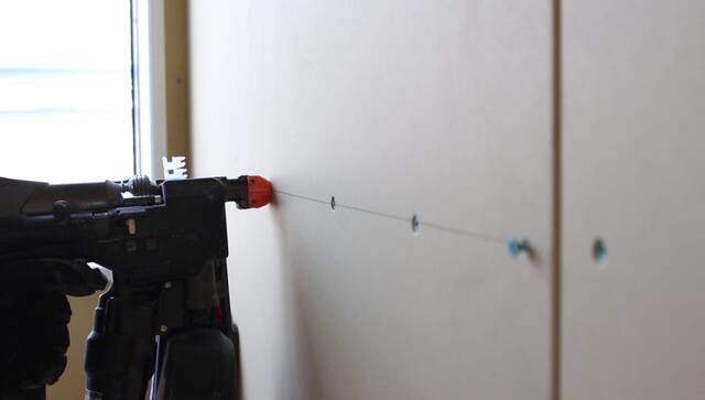 (レーザー墨出し器を使って垂直を確認しながら調整。)