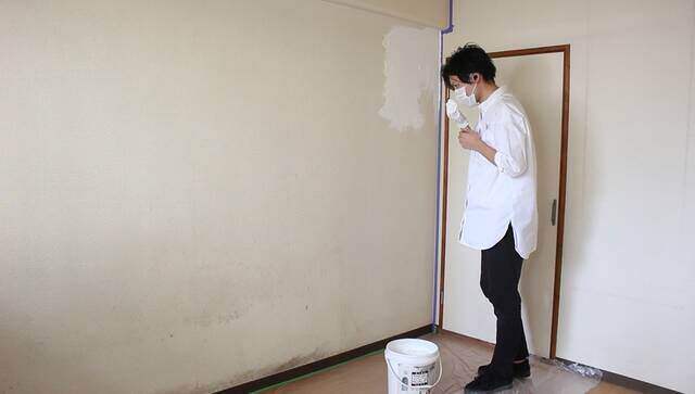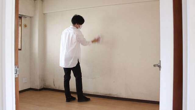 MORUMORU(モルモル)を塗る前に壁を水拭きして、ホコリやヤニ汚れを拭き取ります。