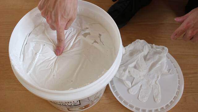 手で塗るMORUMORU(モルモル)の商品名の通り、コテを使わずに手で塗れるように硬さが調整されています。練り漆喰などは多少の硬さがあるので塗ると疲れますが、モルモルはホイップクリームのように柔らかいので小さい子でも簡単に塗れると思います。