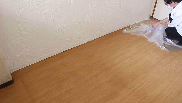 壁際にはマスキングテープ(幅が広いタイプを使うと良いです)、床にはマスカーを使いました。この時、モルモルを塗っているとボトボト落ちるので壁際までしっかり養生してください。