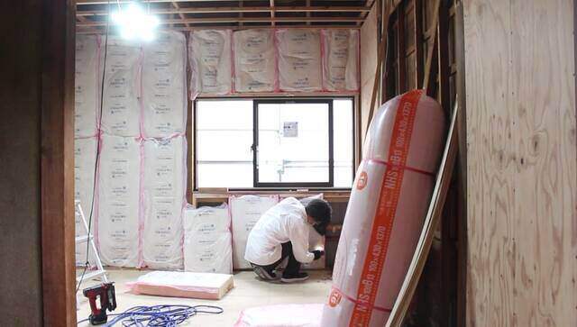 間柱を追加したことで105mmの奥行きができたので、間に厚さ100mmの断熱材を入れてタッカーで固定していきます。