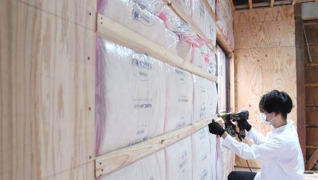 間柱の固定が終わったら外壁面に断熱材を入れて胴縁を取り付けます。