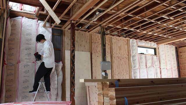 まずは2階の壁に断熱材を入れて、石膏ボードで仕上げられるように壁をふかします。