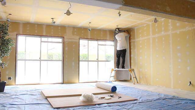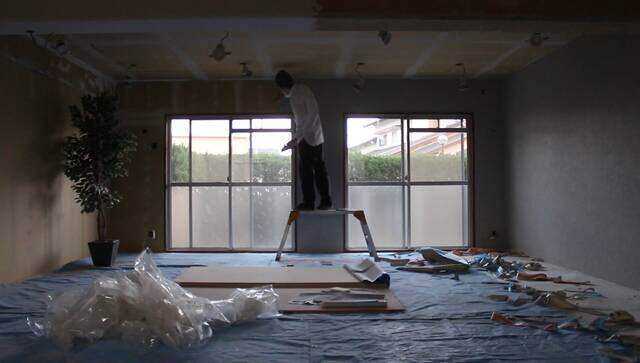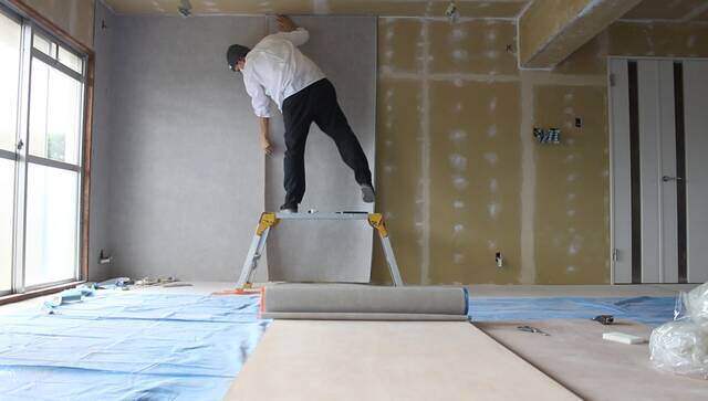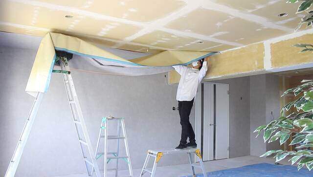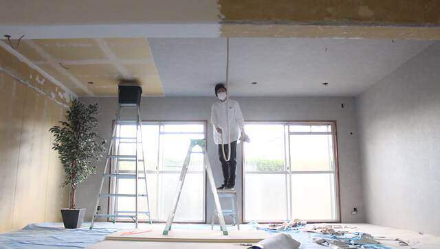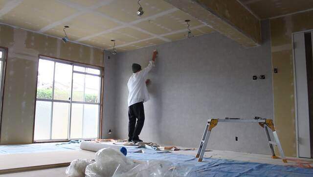 天井の壁紙貼りは大変ですが、脚立の補助があれば何とかなります。