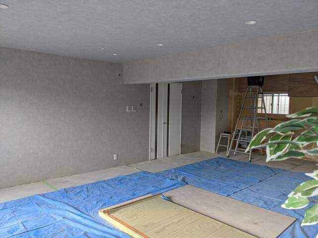 今回はリビングキッチンに石目柄の壁紙を貼る作業です。
