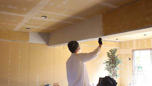 石膏ボードの壁は「下塗り用パテ」「上塗り用パテ」の2度塗りで仕上げています。