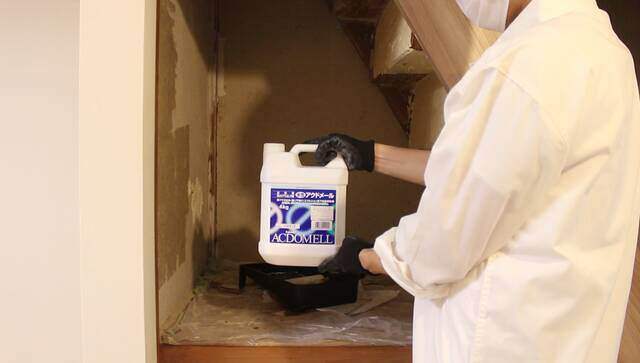 土壁に漆喰を直接塗るとアクがでて茶色くなってしまうので、「アクドメール」 4㎏を使って固めていきます。壁はだいぶ古く、ボロボロ落ちてしまうのでたっぷり吸わせます。