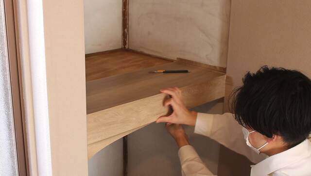 ボロボロの状態だった中板・前框には、階段と同じ柄の「ナオスシート」ウィンザーオークNを貼りました。