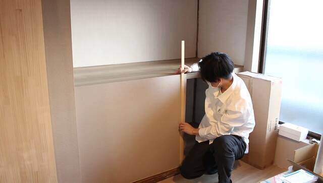 2階の押入れは土壁ではく白い塗り壁なので壁紙を貼って仕上げます。