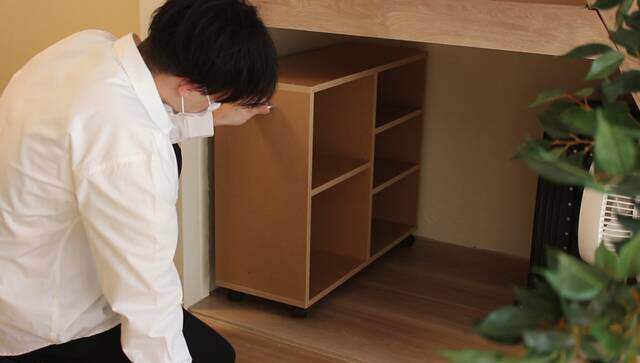 下段は、床の強度が微妙だったので、引き戸があった場所まで5.5mmのベニヤ板を敷いて補強しています。ここは唯一の収納スペースなので、少し大き目の物を収納する感じで使いたいと思います。