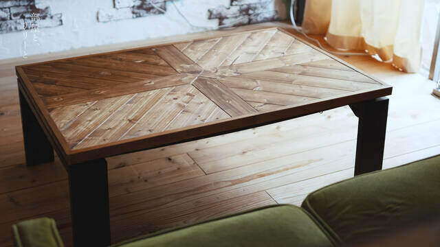 こちらのテーブルもDIYで作られたそうで、天板を壁のヘリンボーン柄に合わせました。