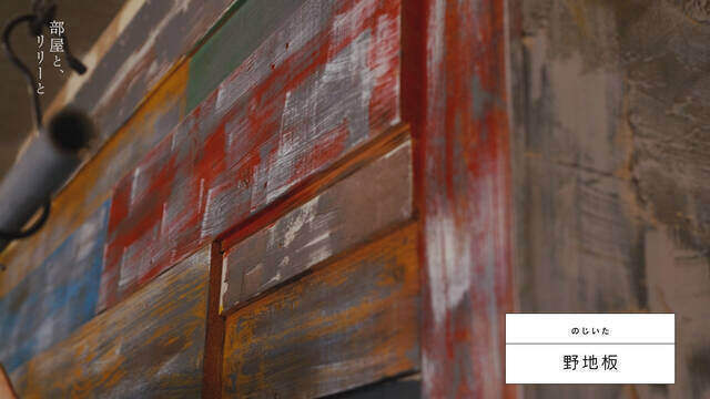 奥にもDIYされた壁があります。野地板を荒く塗装したものに———