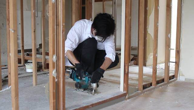根太は再利用するので、切らないよう丸ノコの刃を12mmだけ出して床に切れ目を入れました。(合板の厚みぶんだけ切れ目をいれました)