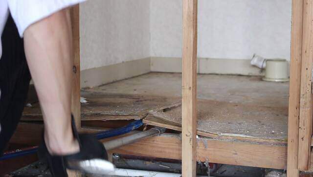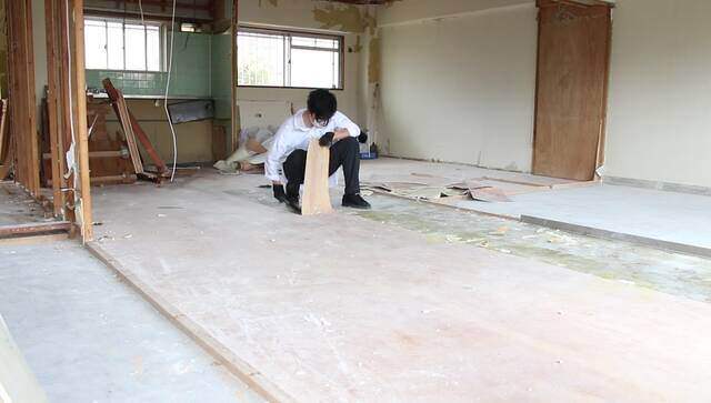 廊下の下に配管が通っているので、貼ってあるクッションフロアを剥がし、床に切れ目を入れ解体。