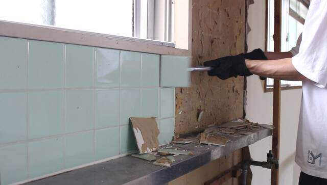 石膏ボードの上から接着剤で固定しているので、タイルの真ん中あたりにスクレーパーを差し込み、めくるように力を加えると綺麗に剥がれます。