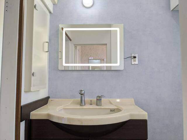 壁紙を張替えて、曇り止め調光調色付きのミラーを設置しています。