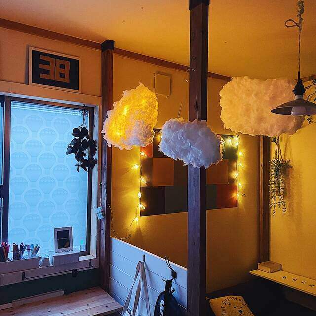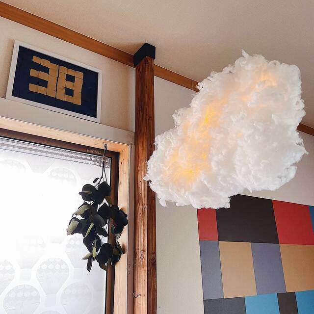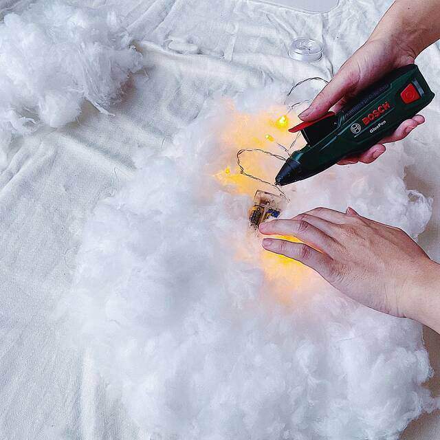 今回は2点製作したのですが、1つ目は同じくマルチカッターで養生パネルをカットし、セットに入っているグルーガンで綿とライトを付けて雲のような「もふもーふライト」を作りました。