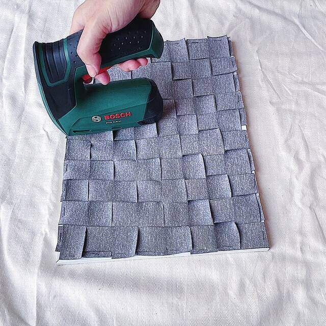 もう1点は、ボッシュのコードレスタッカーを使って、フォトフレームと余った合皮でオブジェを作成しました。フレームの裏からしっかりと簡単に合皮を留めることができたので合皮を編む作業に役立ちました。