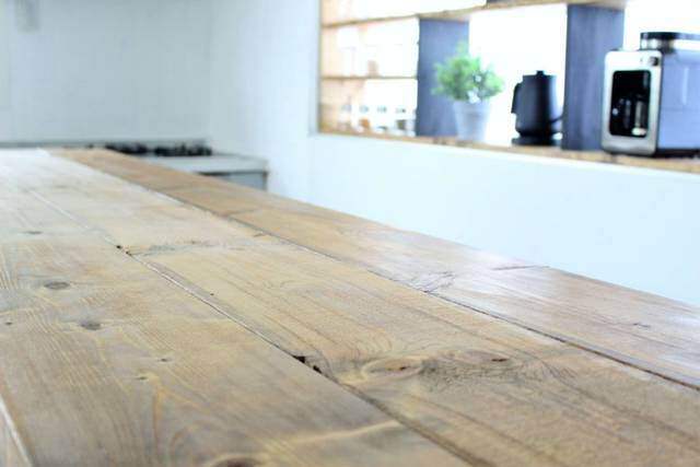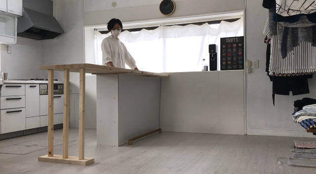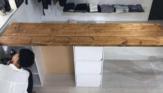 真っ白にセルフリノベーションした部屋に合うカウンターテーブルを作っていきます。