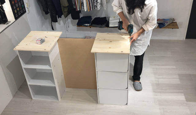 天板を支える土台は、高さ88㎝のカラーボックスを2つ使い、背面を白い化粧板で整えようと思います。