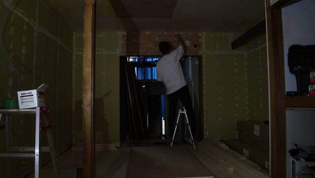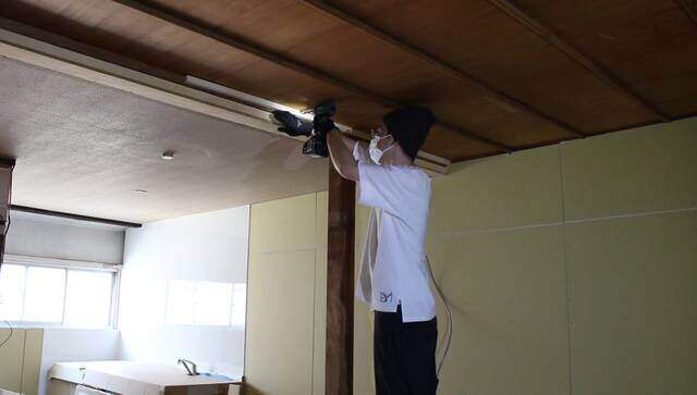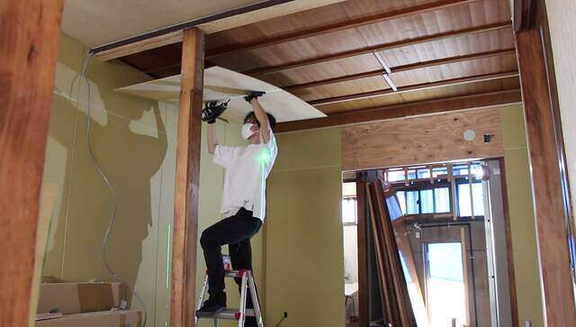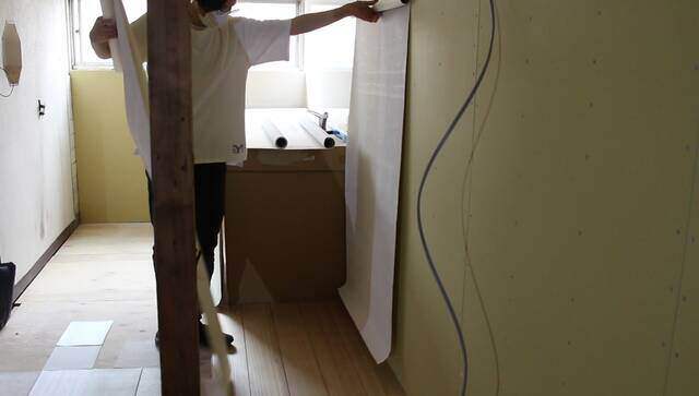 今回は天井に5.5mmの板を張り、壁紙選びとパテ塗りまで進めます。