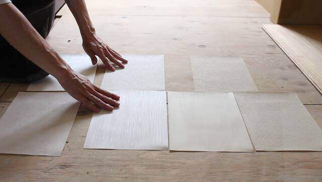実際に使う床材を敷いて、取り寄せたベージュ系の壁紙を1つずつ試しています。