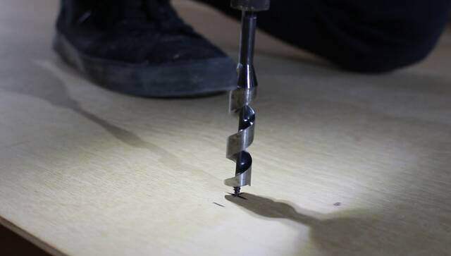 照明コンセント位置は、配線が通るように木工ドリルビットで穴を開けておきます。