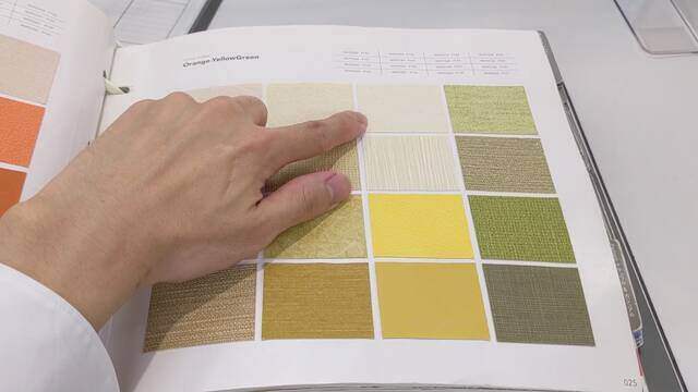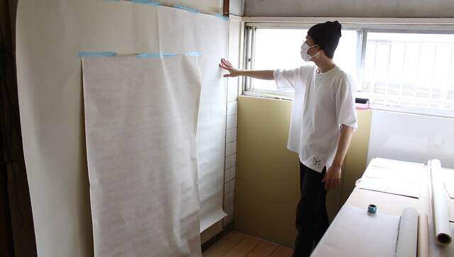 同系色の壁紙を壁に張って色の違いを見比べます。