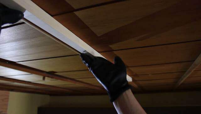 石膏ボードに比べてベニヤ板は軽いので、比較的簡単に天井を塞ぐことができました。