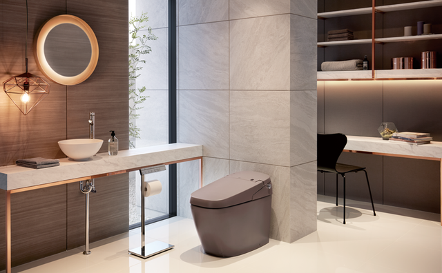 また、ダークブラウンのキャビネットと光沢のあるリモコンやペーパーホルダーがさらに高級感を高め、間接照明がモダンな雰囲気を演出しています。