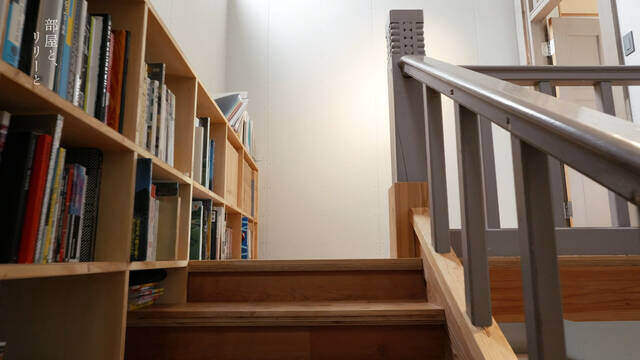 入口から入ると階段と本棚があって、奥は事務所のようです。