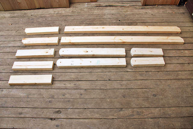 木取り表にしたがって、2×4材、1×4材をカット。ただし座板の受けと足置き板の受けは、まだ繋がっている状態です。