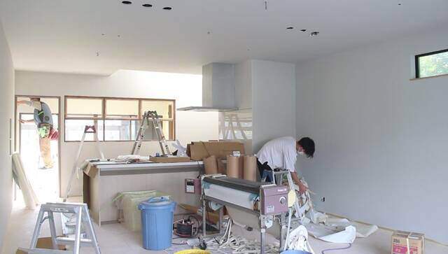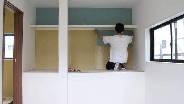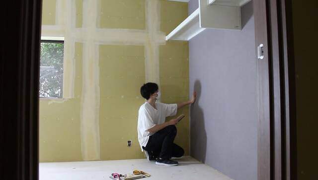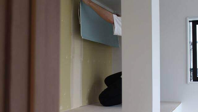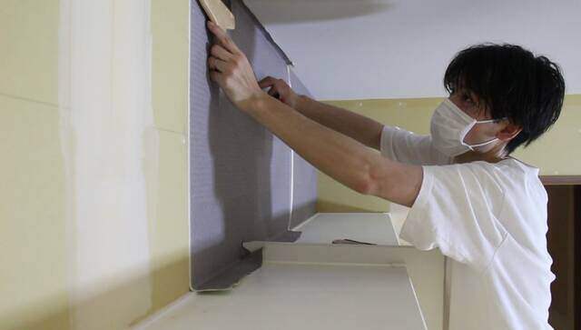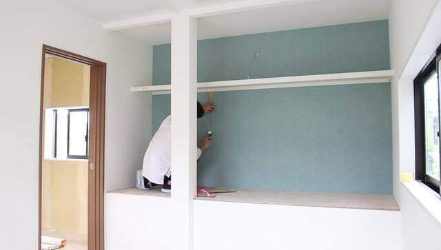 前回はクリナップ「ラクエラ」フラット対面I型の取り付け作業でした。今回は壁紙を貼る作業で、パテをしてアクセントクロスを貼ります。