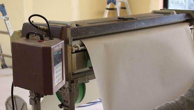 壁紙をエッジ部で押さえて、定規の両面を丸形に加工しているクロス用定規。