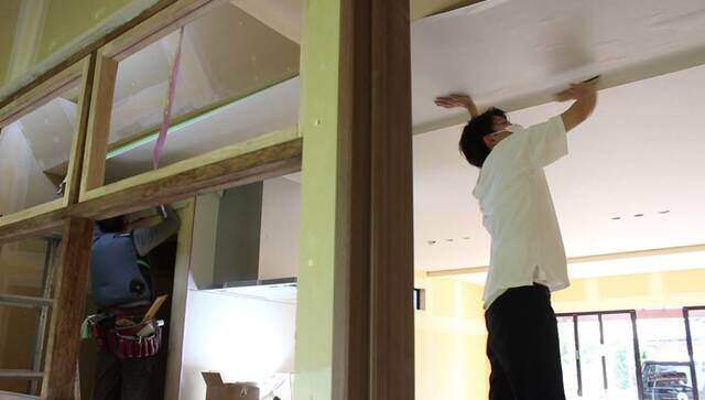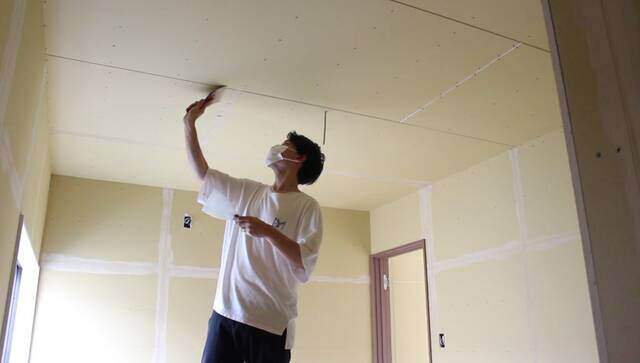 石膏ボードの上からだと繋ぎ目やビス穴に空気が入り、壁紙を貼っても綺麗にならないのでパテで壁と天井の穴を塞いで平にしていきます。