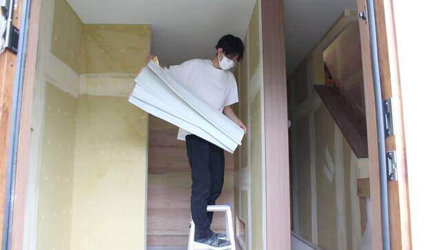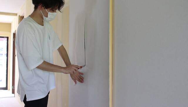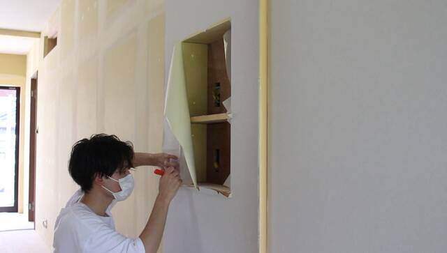 集成材を入れている箇所は、板の真ん中に切れ目をいれないと上下の壁紙が足りなくなるので慎重にカットしています。