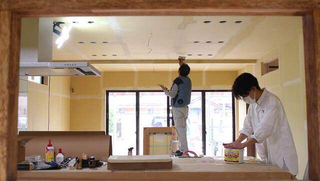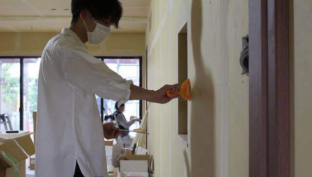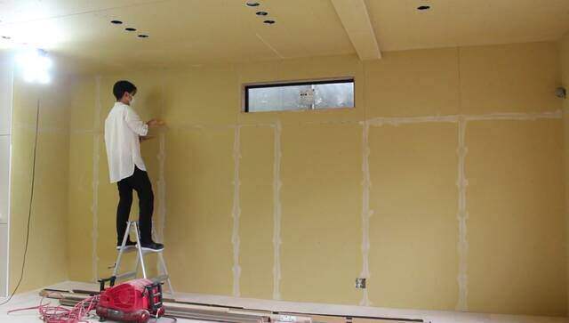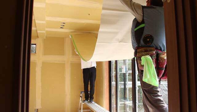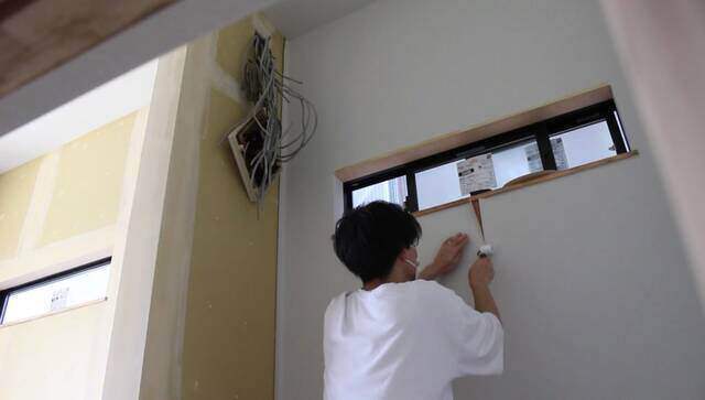 ビスパッチでビス穴をひたすら埋めている間、壁紙屋さんは下塗りが終わった箇所を上塗りパテで仕上げています。
