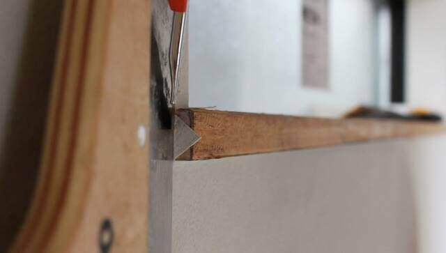 窓下に取り付けた集成材棚の部分は棚の真ん中に切れ目を入れて上下に割り、角は斜めに切れ目を入れて上下に分かれるようにして納めます。