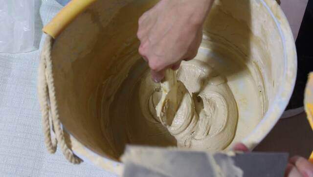 粒子の粗い下塗りで溝を塞ぎ、中塗り→上塗りという準備で徐々に平になるよう塗っていきます。