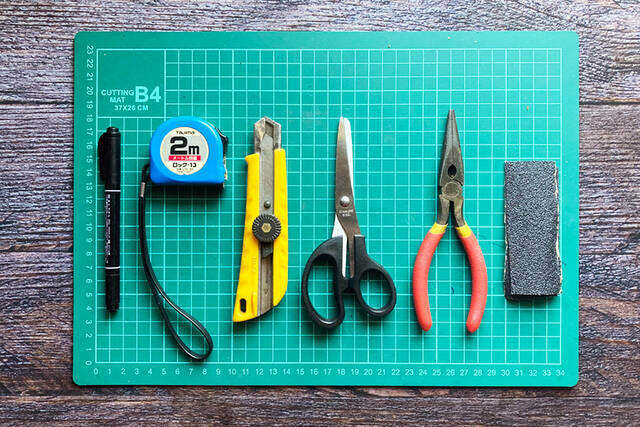マジックペンで印を付け、カッターで切り込みを入れて、ハサミで切っていきます。