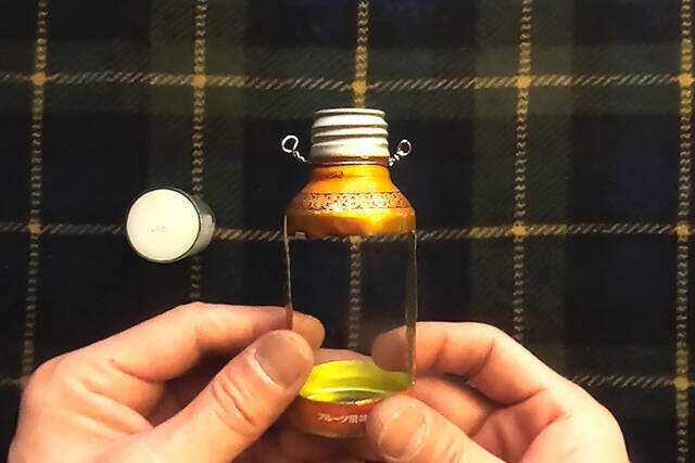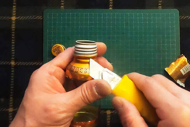 切り終わったら、キャップの留め具をカッターで切って外します。